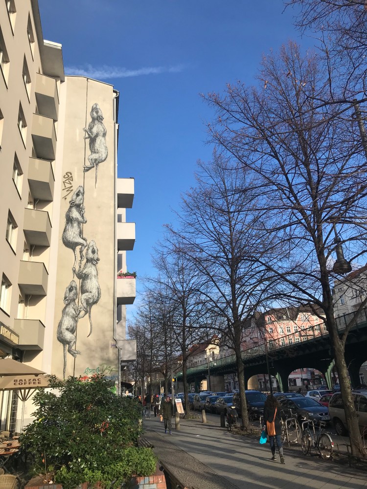 ROA often incorporates a moral message into his work as well: about our treatment of animals, the meat industry and the impact of our rapid urban expansion. He often relates the animals he paints to the environment: sometimes in relation to the actual building he’s painting on, but normally just a reference to the native animals you would find in that particular city landscape. ROA is drawn to urban environments, mostly abandoned or with an industrial past, and often focusses on places that are beginning to be reclaimed by nature. He details “animal species in their lost habitats all over the world”, often the smallest, forgotten, creatures who are here made massive by his art, just like the rats I found in Berlin (featured higher up).