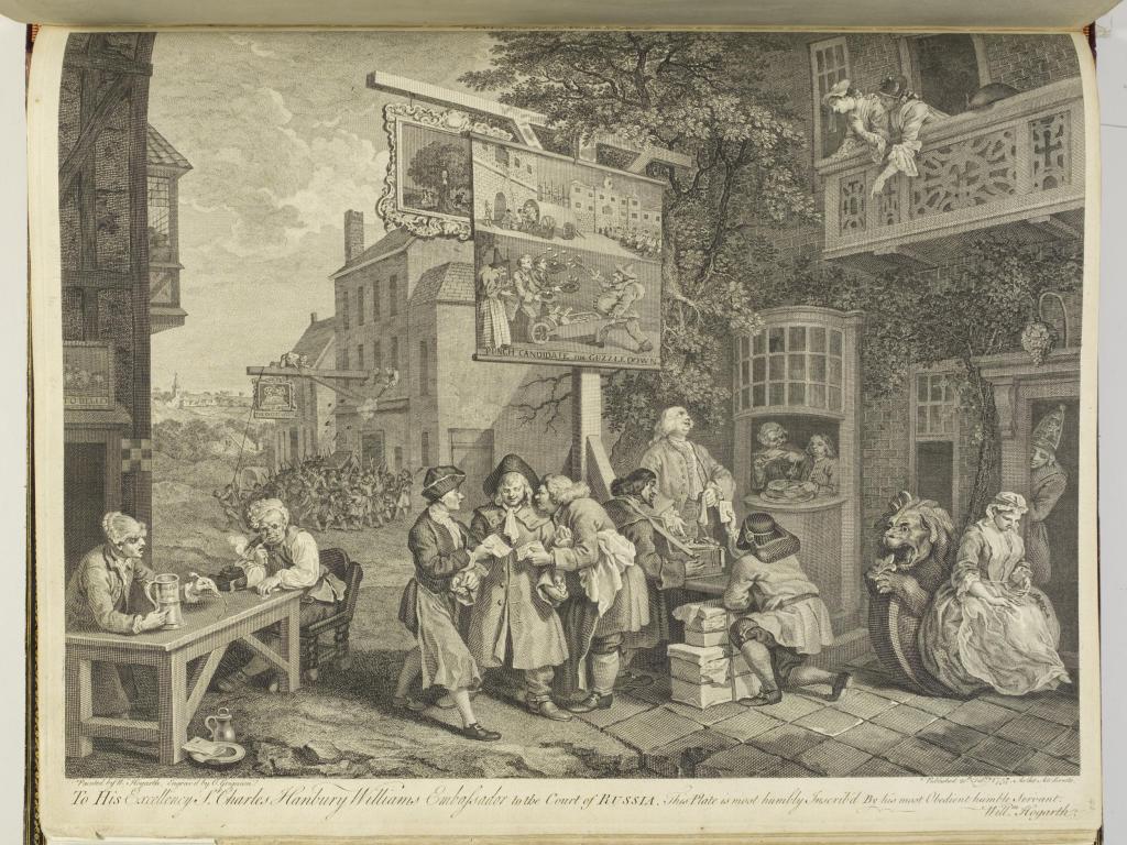 Harrington and Hogarth are both social commentators. Hogarth highlighted issues in society which were a growing concern and were often being ever more pointedly ignored by the general populace. We can see this in Humours of an Election, which was produced as a series of four paintings in 1755.