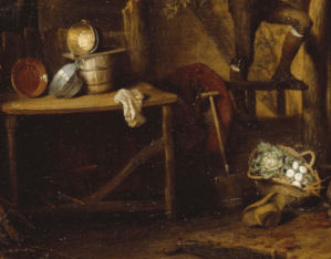 Here, however, these peasants are pleasingly hard-working and industrious. We can see the evidence of their hard work: the woman is darning or embroidering an item of clothing, they take pride in their home (the man has the time to attach roses to the outside of the house), there are the collected eggs and cabbages just underneath him, and the pots to the left are spotless. They are the “virtuous poor”.