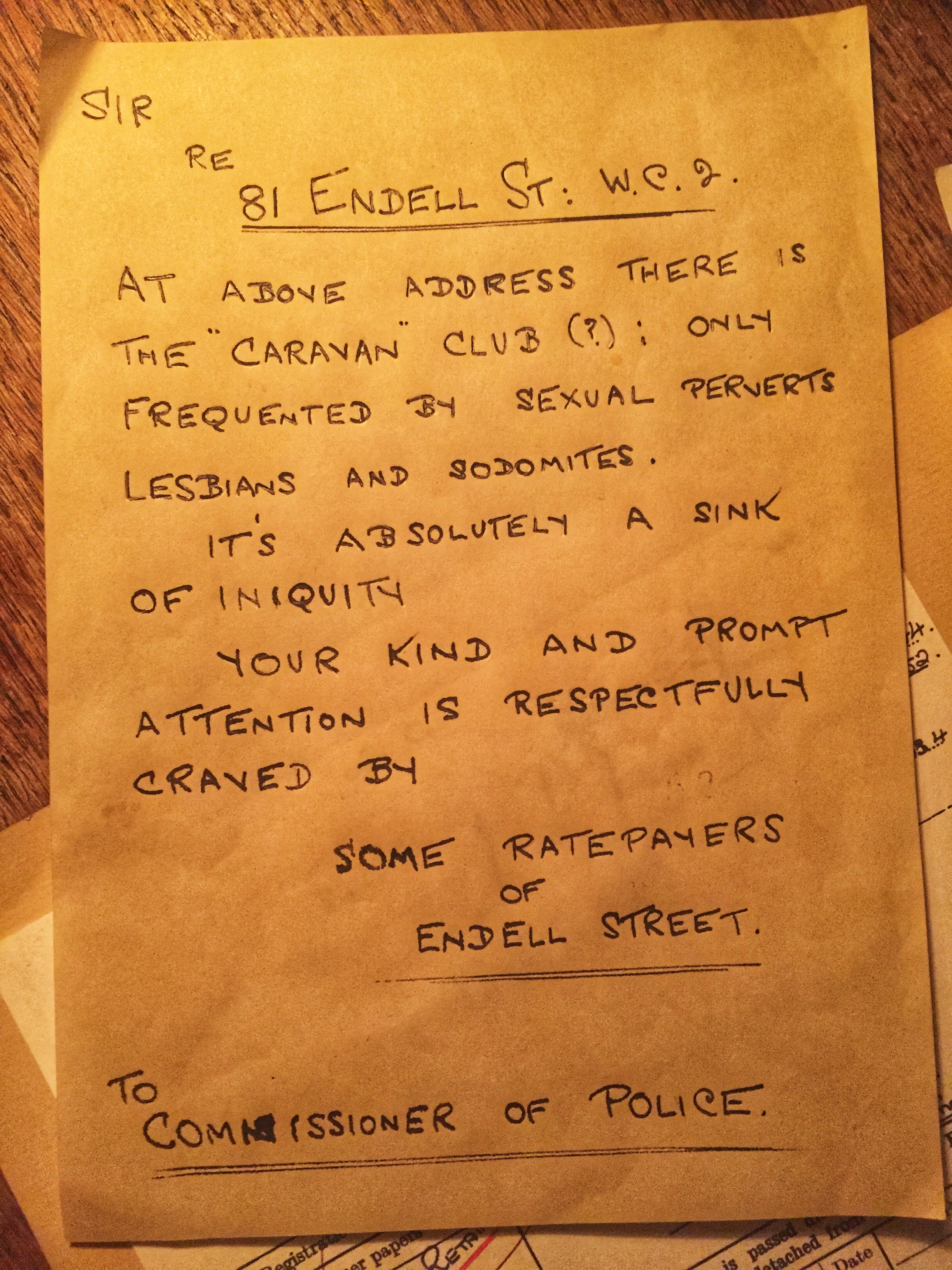 Unsurprisingly, the Caravan Club was not universally welcomed. The police surveillance from 1933 started because they were receiving so many letters of complaints. One anonymous writer was outraged by this establishment which was “only frequented by sexual perverts, lesbians and sodomites. It’s absolutely a sink of iniquity.” Many of these anonymous letters (against the Caravan Club as well as other similar venues in Soho) were signed off, “A Citizen”, “An Englishman”, “pro bono publico” (for the public good”) – they saw it as their moral and civic duty to shut these places down.