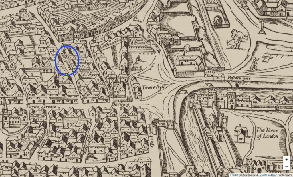 Everything I now know about Mary Fillis comes from Miranda Kaufmann’s book Black Tudors – a really fascinating and thorough exploration of Black people in Tudor England (a period from the end of the fifteenth century to the very beginning of the seventeenth). Mary Fillis was born in Morocco in 1577. Her mother is known only as Fillis of Morisco (meaning Morocco), who was a basket weaver and shovel maker. Mary Fillis left Morocco at a very young age, only about 6 years old. We don’t know the circumstances under which she left her home and her family behind her, but by around 1583/84, she was living in central London, on Mark Lane, near the Tower of London, as a servant in the household of merchant John Barker.