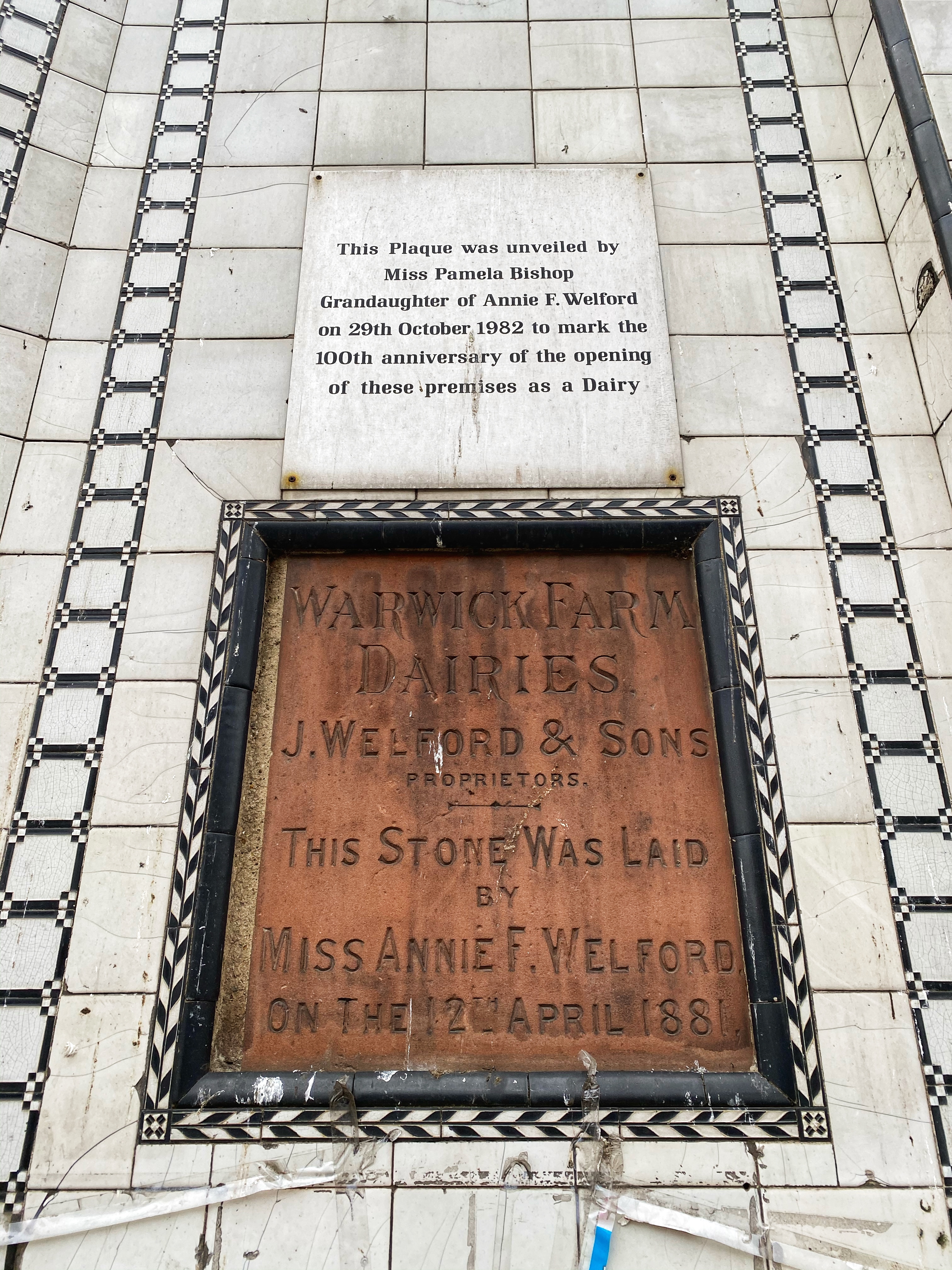 It seems like the dairy was here in Maida Vale right up until 1983. You can also find a plaque on the outside, installed in 1982 to mark the centenary of the Dairy opening on this site. It was unveiled by Pamela Bishop, the granddaughter of Annie Welford, who’d laid the original foundation stone back in 1881. Annie was, in turn, the granddaughter of Richard Welford, taking the family history right back to the purchase of Warwick Farm in 1845.
