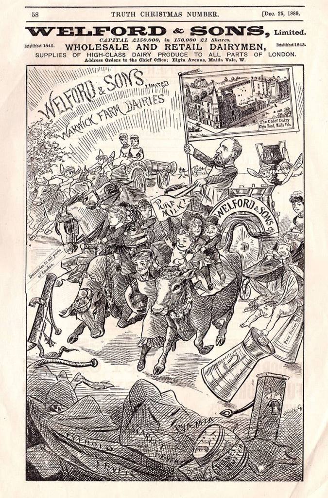 The little angels and healthy, fresh-faced children, brandishing “Pure Milk!” flags and churns of “Pure Butter”, chasing away the Grim Reaper and all his associated lackeys: typhoid, scarlet fever, and pyaemia (a type of sepsis). I can’t quite make out what that angry barrel with the webbed feet is meant to be in the bottom left, but possibly something about the Thames. Whatever he is, he’s not your problem if you’re drinking Welford’s milk! There’s even a little diagram of the Maida Vale dairy in the top right corner.