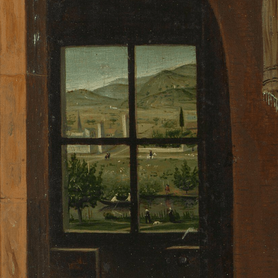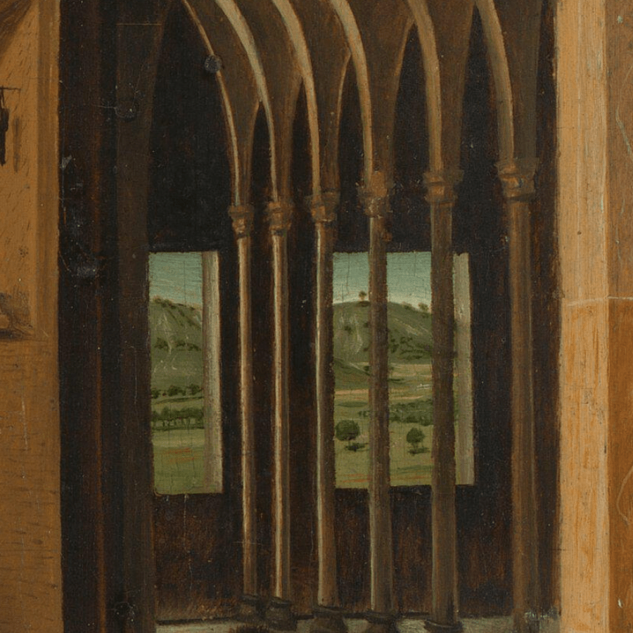 Returning to our painting, the division between two halves is further reflected in the views through the windows. On the right hand side, the landscape is a hilly, fifteenth-century European wilderness. No other people and a lush, green paradise. The path to salvation as St. Jerome theorised it: via a simple, solitary life.