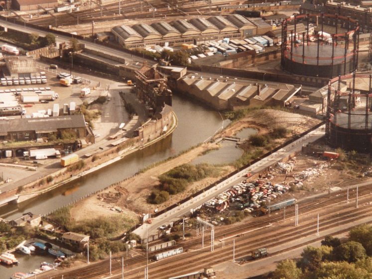 The gas holders were part of Pancras Gasworks, built by the Imperial Gas Light and Coke Company. Gasholder No.8 (the garden) was built in the 1850s and 10, 11, and 12 in the 1860s, although all the frames of all 4 were rebuilt in the 1870s and 1880s to enlarge them. They weren’t actually located here, but on the other side of the canal – a vast site, covering 11 acres at its height in 1900.