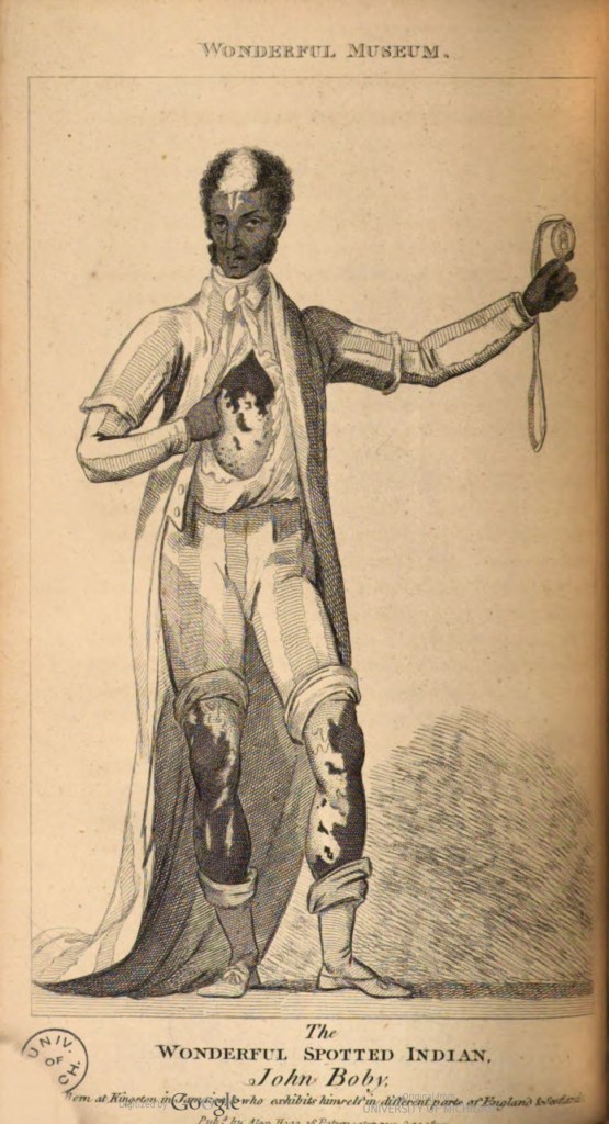 He is John Bobey, John Richardson, Primrose, John Richardson Primrose Bobey, “the Wonderful Spotted Indian”, “the Celebrated Piebald Boy”. R.A. Hogarth in his article theorises that “Primrose” may have been the alias that Bobey used early in his career as a sideshow act, but it’s unclear when exactly he adopted the name or if it was forced upon him. Later in his career, however, he chose to go by the name John Bobey.