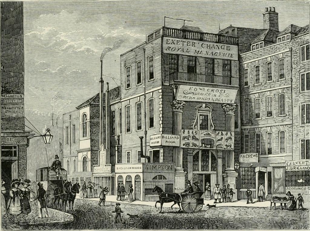 Bobey was originally exhibited on Haymarket in London for two months before he was bought by showman Thomas Clark and moved about ten minutes down the road to Strand. Clark had a shop in the Exeter Change, a building on the north side of the street (just east of Burleigh Street today), which was demolished in 1829. From the 1780s, Clark had leased the second floor and started exhibiting wild animals, like lions, and, sadly, people like Bobey.
